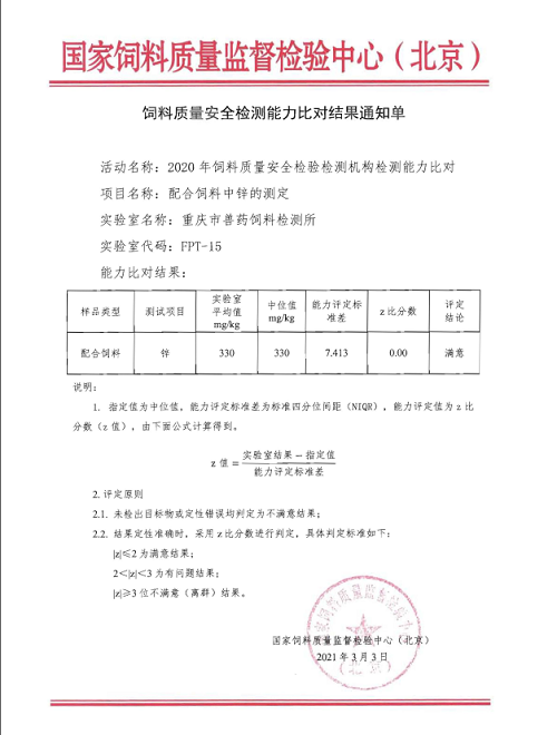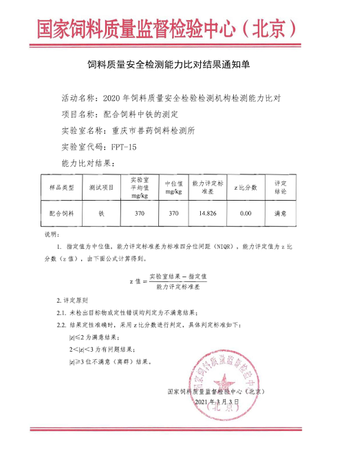 为持续提升饲料质量安全检验检测机构的技术能力和质量保证水平,确保监测数据准确、可靠,重庆所于2021年1月参加了由国家饲料质量监督检验中心(北京)组织开展的饲料质量安全检验检测机构检测能力比对工作,比对项目分为饲料中常规营养成分(粗蛋白、粗脂肪、粗灰分、赖氨酸、铜、锌、铁、锰)和饲料中药物残留(金霉素)两类,共9项参数。国家饲料质量监督检验中心(北京)近期通报,重庆市兽药饲料检测所参加的9项饲料检测能力比对项目结果全部荣获“满意”等次,其中锌、铁、锰三个参数与标准结果吻合度为100%,偏差为零。
