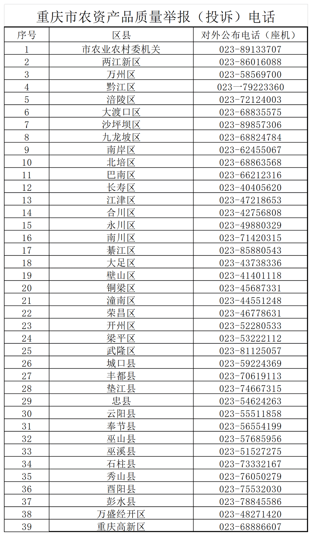 第1眼TV-华龙网讯(首席记者 冯珊)为持续加强农资质量监管,严厉打击制售假冒伪劣农资违法行为,规范农资市场秩序,保障农业生产安全和农产品质量安全,近日,重庆市农业农村委员会,现面向社会公布了农资质量投诉举报电话。